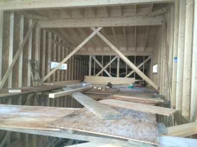 屋根下地と外壁部分の合板貼りを行っています。