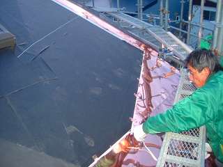 板金工事は屋根板金銅板葺きの作業です。