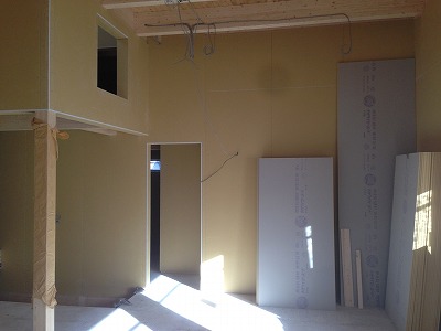 貼り終えた後は、養生を行い、内部足場に備え石膏ボードを敷きます。