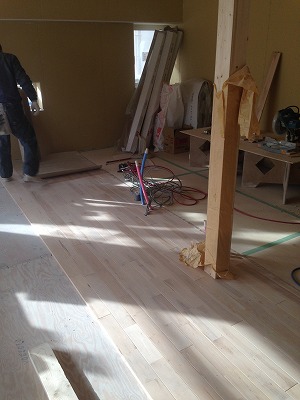 天井に石膏ボードを貼り終え、床フローリング貼りを行っています。