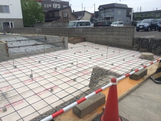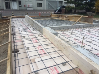 基礎の土間部分に断熱材と鉄筋を組み