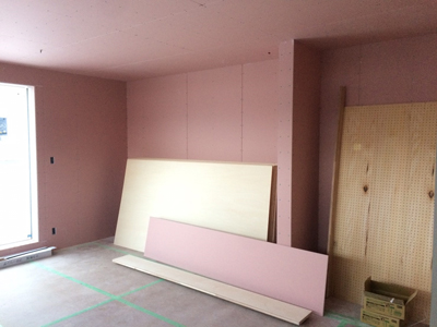 二階天井耐火ボード貼り、階段手すりが完成しました。