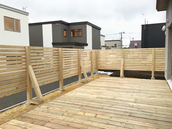 外構束石埋め込み(デッキ・塀)・玄関モルタル・内部造作の施行状況です。