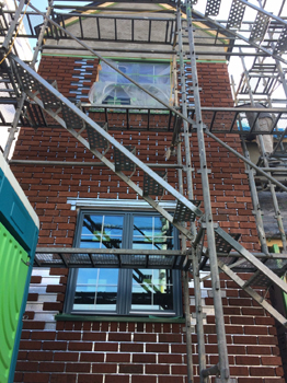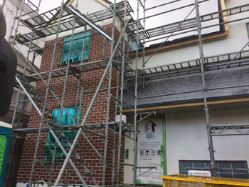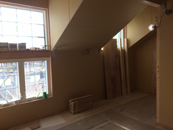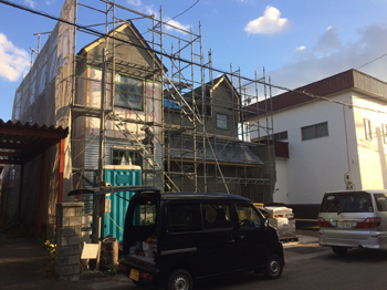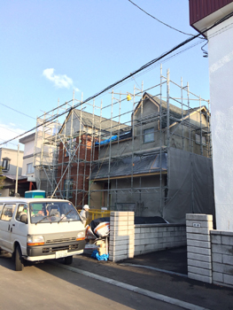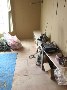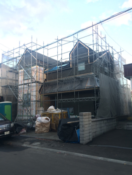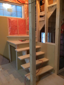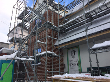 レンガタイル貼り、内部造作、2階床貼りの様子です。
