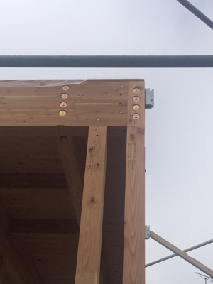 写真の中で5の水平構面ネタレス合板は合板の隙間を写しています、面材は継手を少しラフに隙間を開けることが重要です。