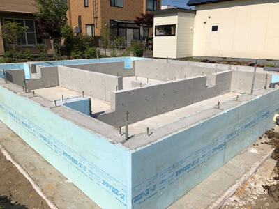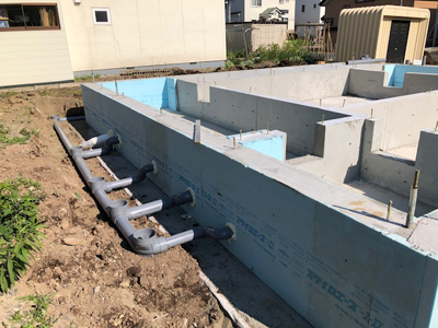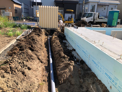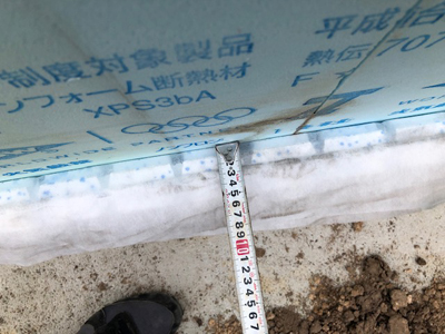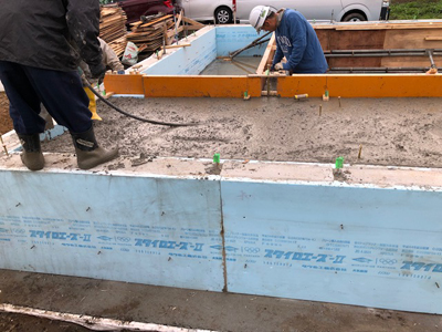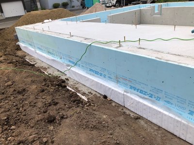 本日はコロンブス工法に必要な材料貼、埋め戻し、基礎天端の平滑作業、など行なっております。