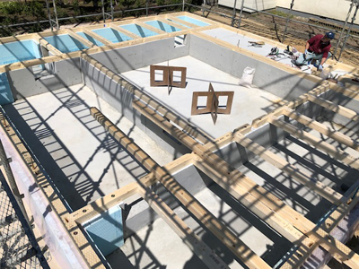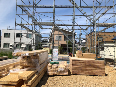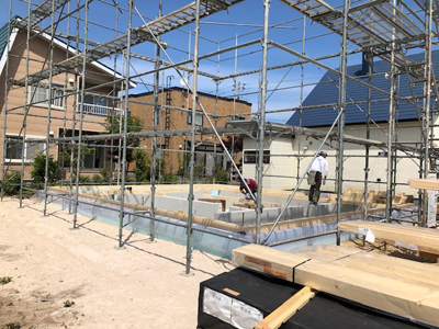 昨日、足場組み立て行いまして、本日より、墨出し、土台敷きを行なっております。