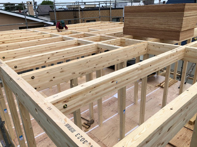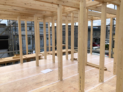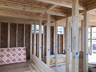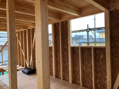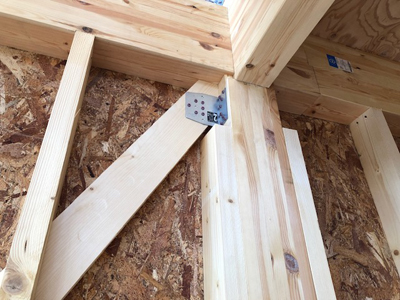 構造金物、筋交い金物、ホールダウン金物などの取り付けが終わり、OSB貼、内部下地など行なっております。