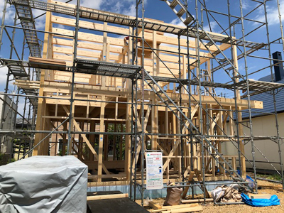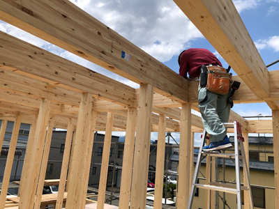 屋根組が終わり、内部筋交い、金物取り付けなど行なっております。