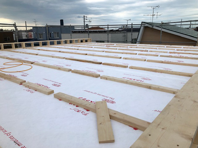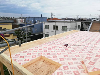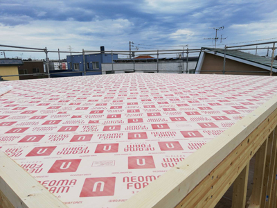 小屋の構造用合板貼、ネオマフォーム100ミリ貼が終わり、屋根勾配下地を行なっております。