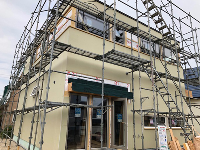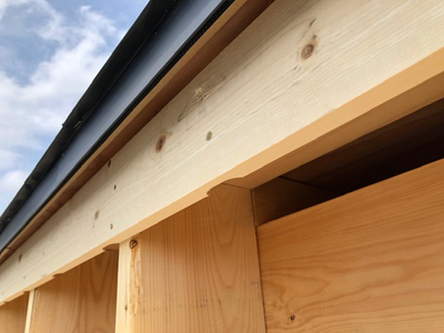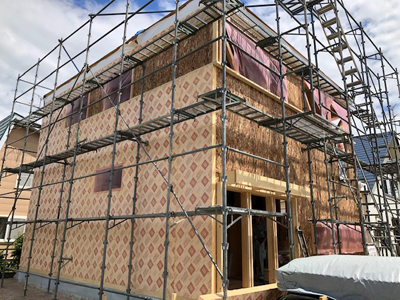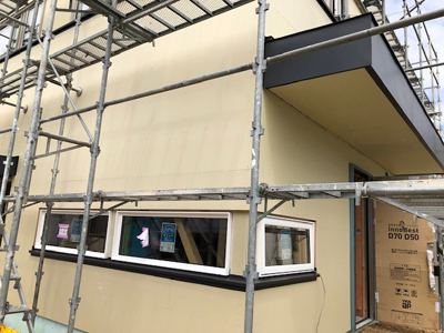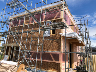外部の大工工事が終わり全体像が見えてきました。下屋の屋根板金も完了しております。