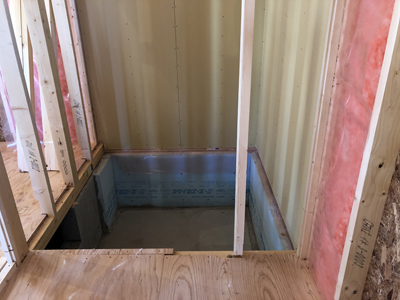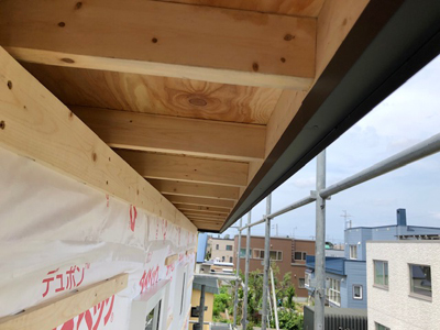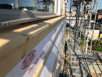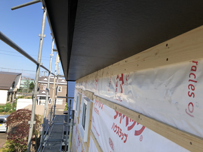 ユニットバス前施工状況、軒天材、水切り部納まりなど確認いたしました。