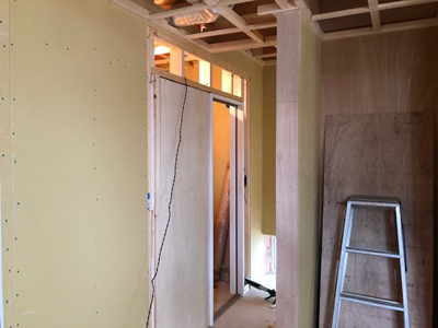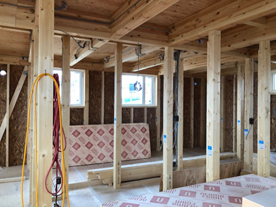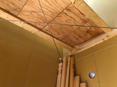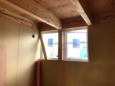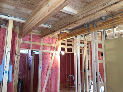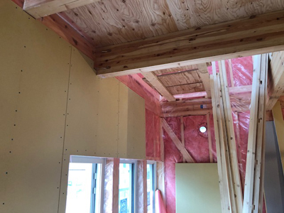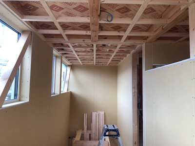 一階は内部ボード貼りが終わり、天井下地や床下地など行なり、水平ブレース、各種設備配管など完了しております。