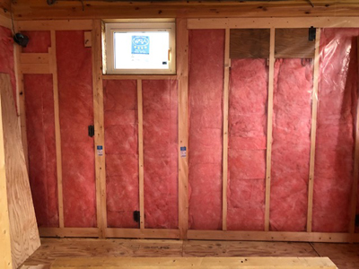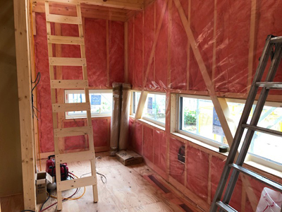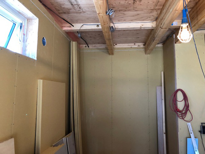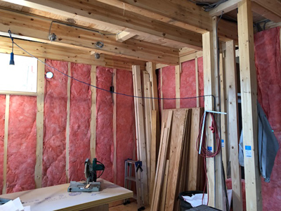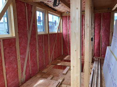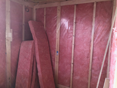 電気配線工事、内部グラスウール入れ、外部防水ボード貼行なっております。