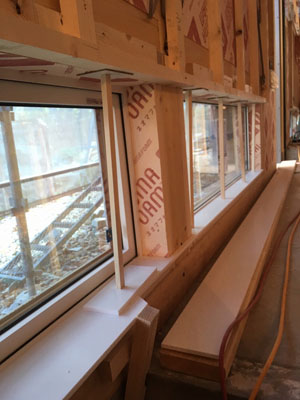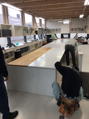 現事務所のカウンターを解体し新社屋の窓台となって生まれ変わりました。