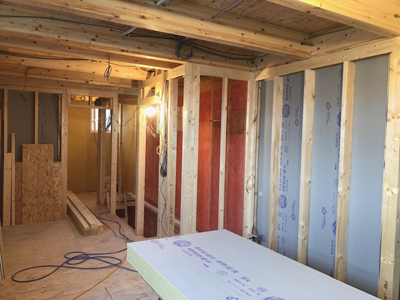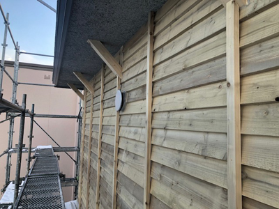 二階グラスウール入れ、外壁板金貼りを行なっております。