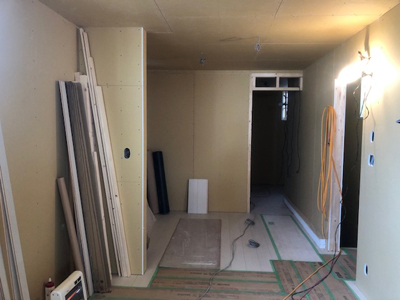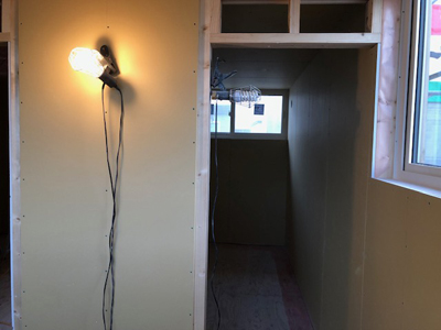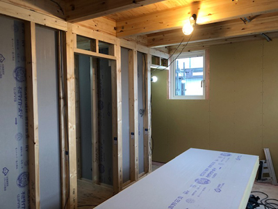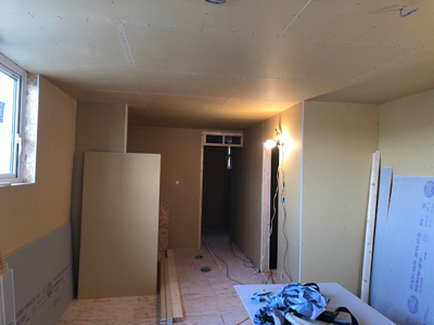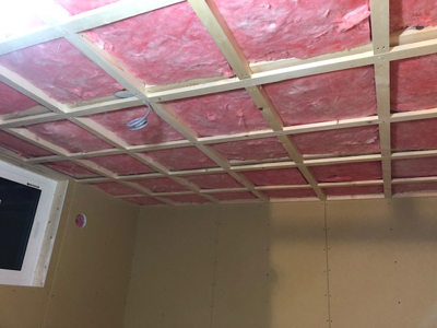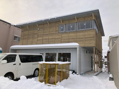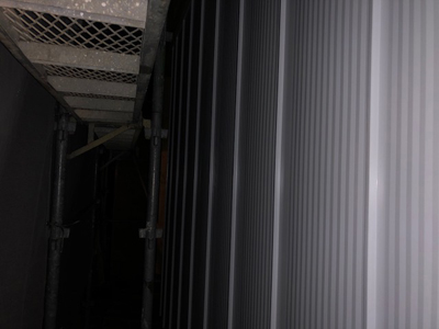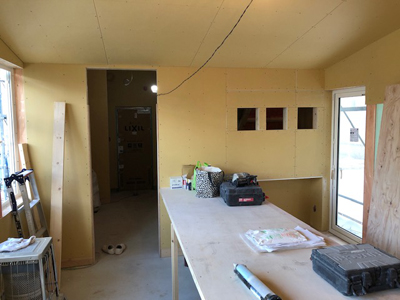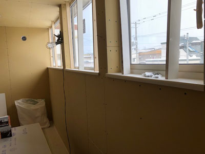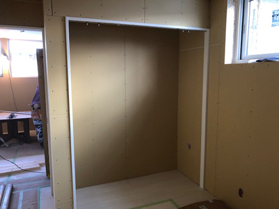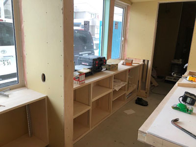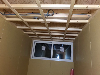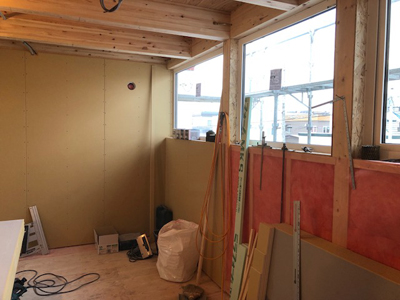 内部カウンター下地、天井ボード貼、外部板金貼など行っております。
