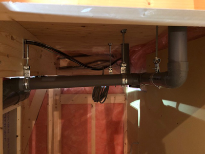 内部排水配管、大工は天井下地を行なっております。