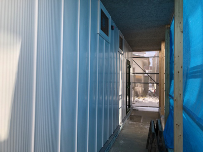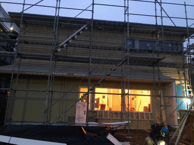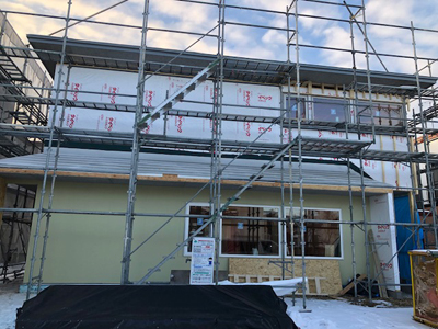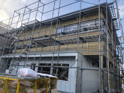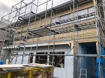 外壁板金が完了し、外観が見えてきました。来週に足場解体となります。